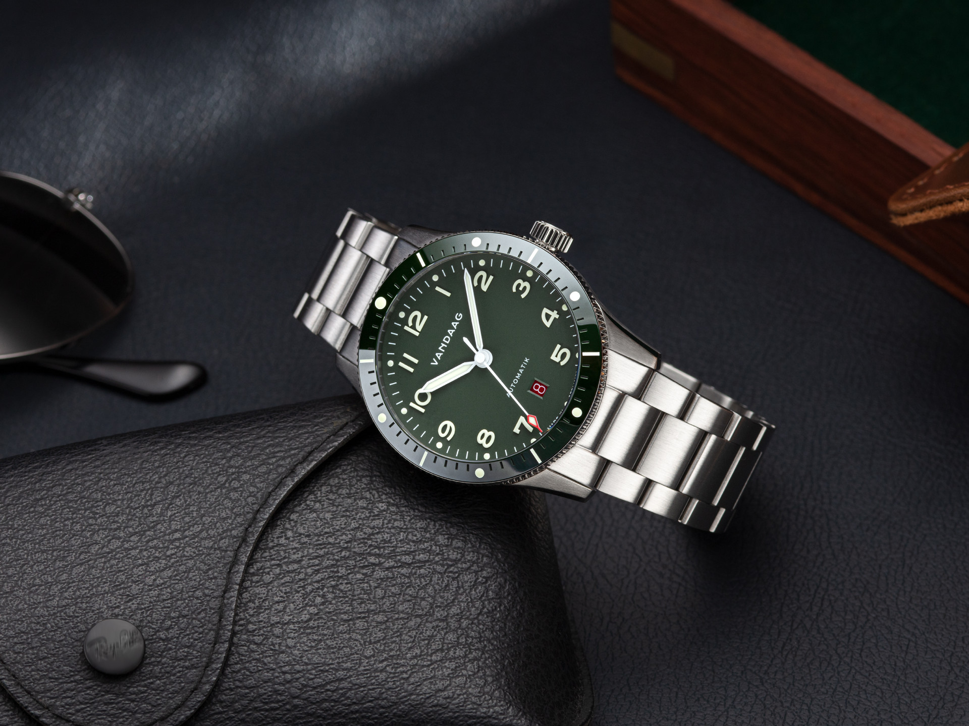 Die aufgeräumte Optik ermöglicht die bestmögliche Kombination aus Design und Funktion. Das Zifferblatt mit deutlichen 11 arabischen Ziffern und matter, grüner Oberfläche wird komplettiert von unserem „Tupfer“ Extravaganz: Dem roten Datum.