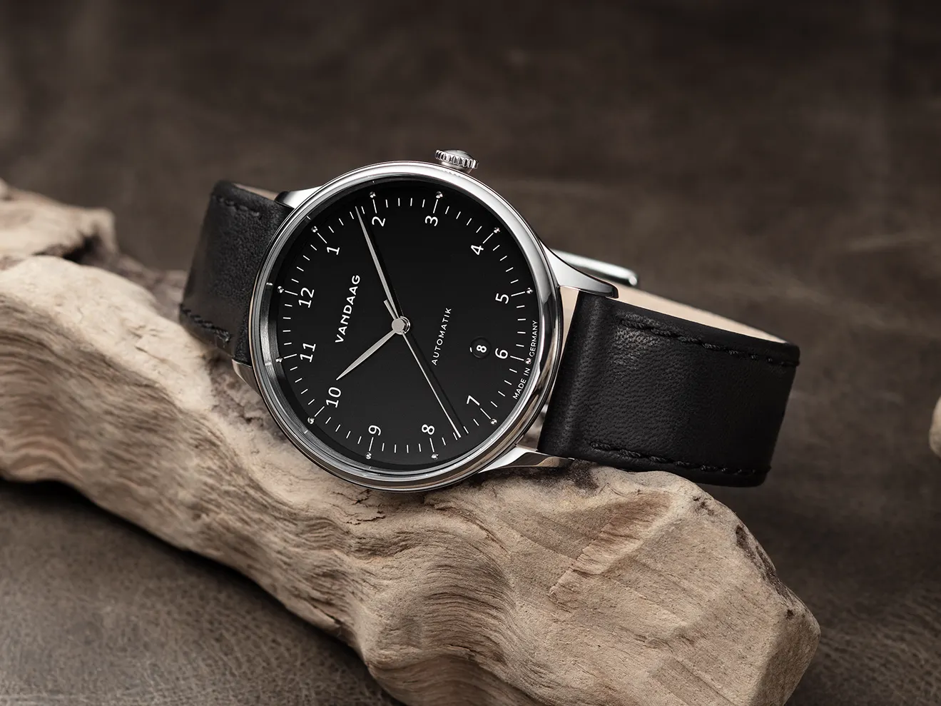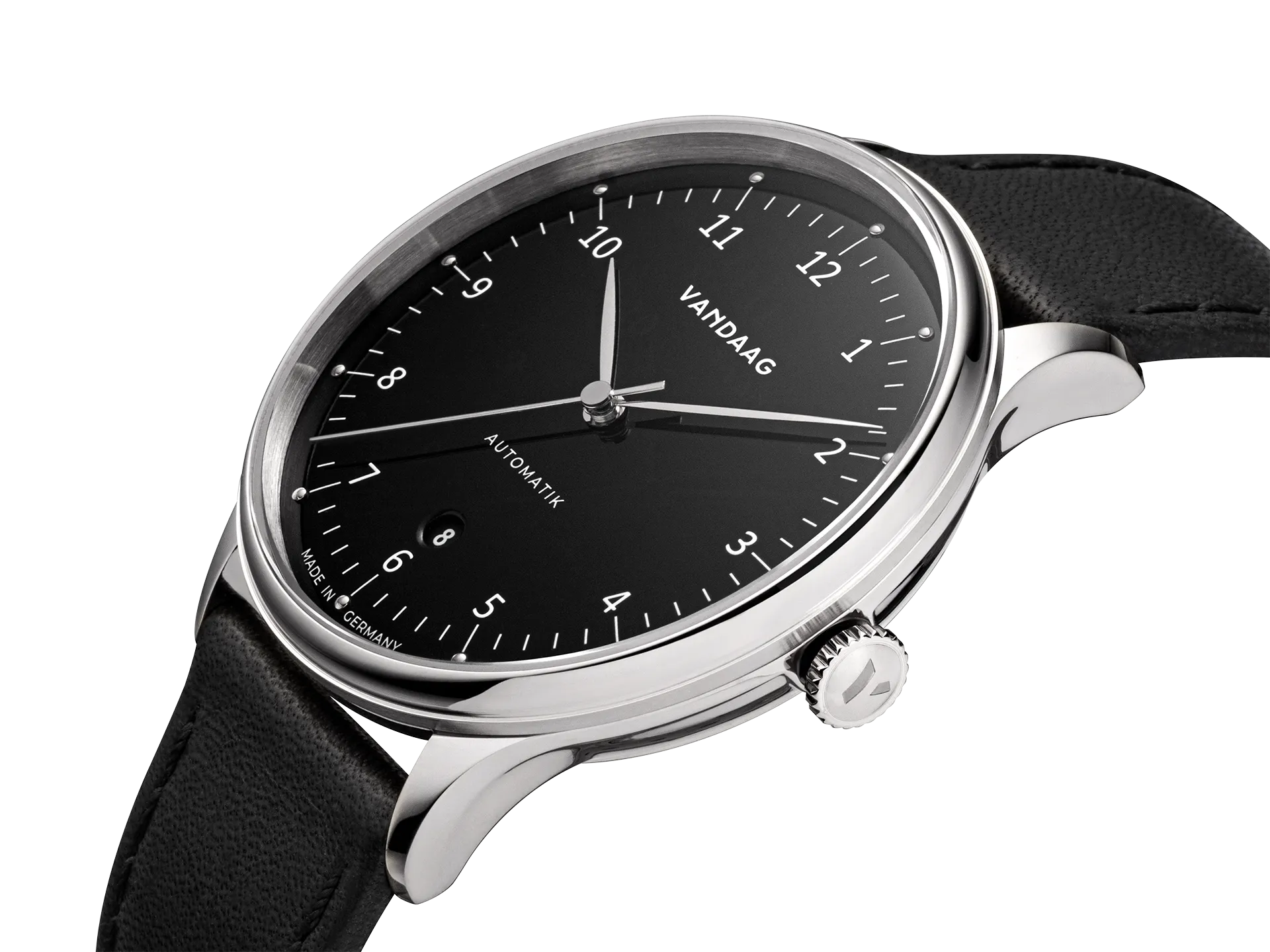 Mit ihrem Retro-Look, dem 40mm Edelstahlgehäuse, dem soften Lederband, dem fein gewölbten schwarzen Zifferblatt und den klaren arabischen Zahlen ist die Primus eine Uhren-Schönheit ohne Alter.