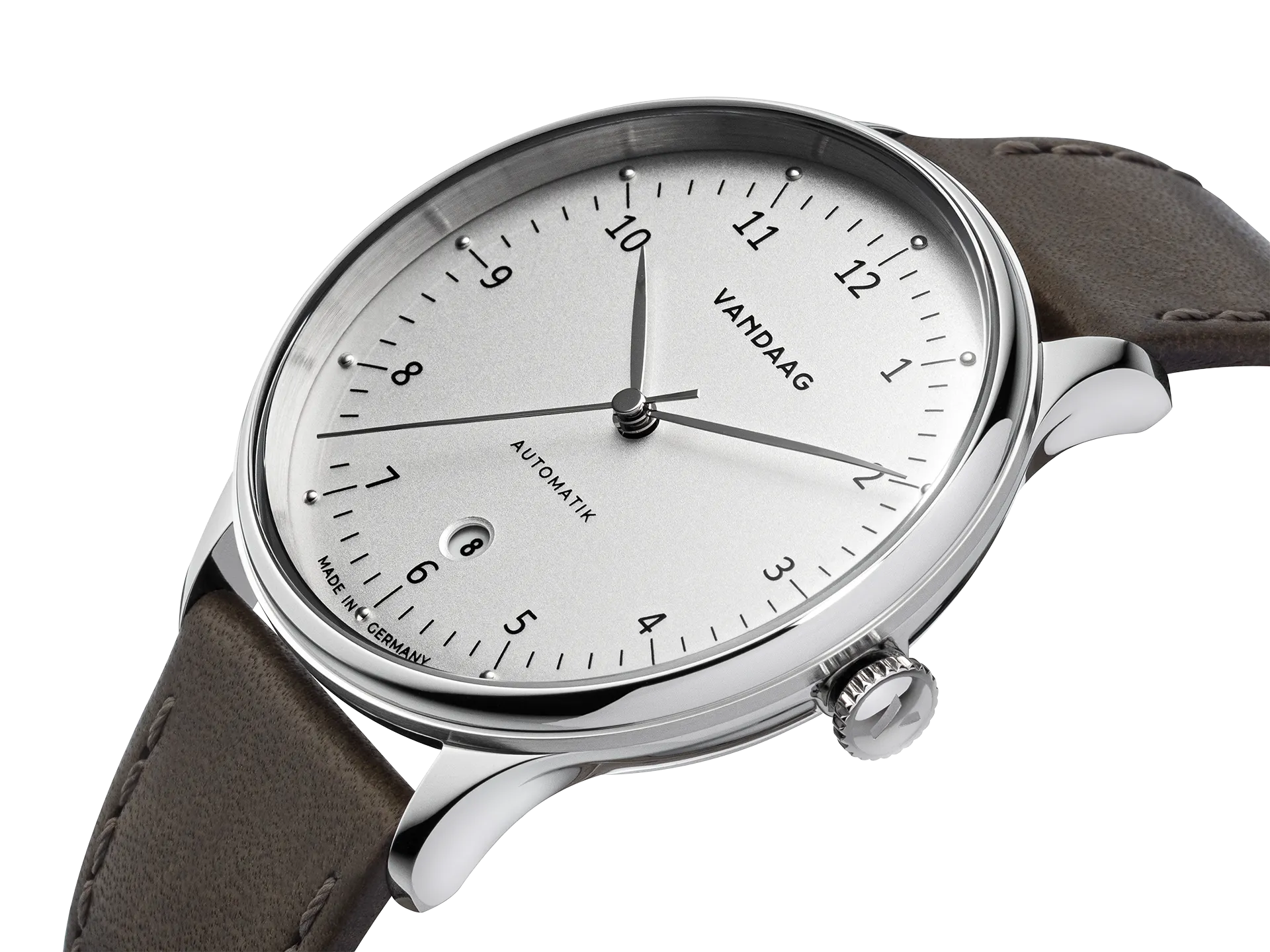 Mit ihrem Retro-Look, dem 40mm Edelstahlgehäuse, dem soften Lederband, dem fein gewölbten silber-weißen Zifferblatt und den klaren arabischen Zahlen ist die Primus eine Uhren-Schönheit ohne Alter.