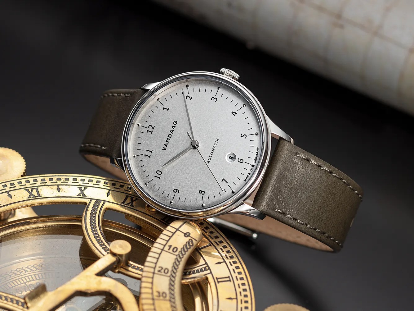 Primus Automatik - Stahl-Silber - grün-braunes Lederband