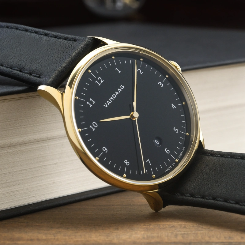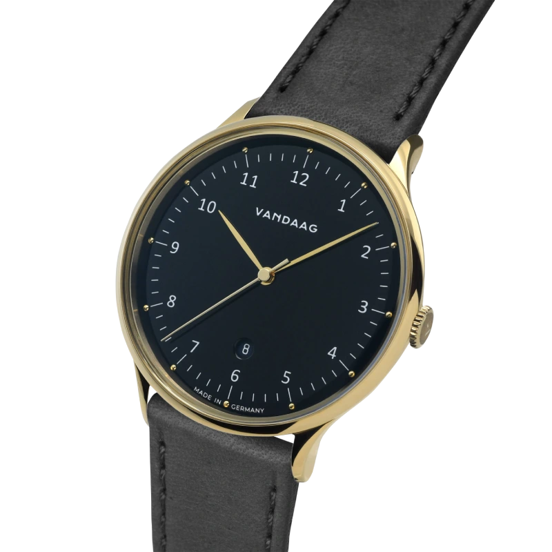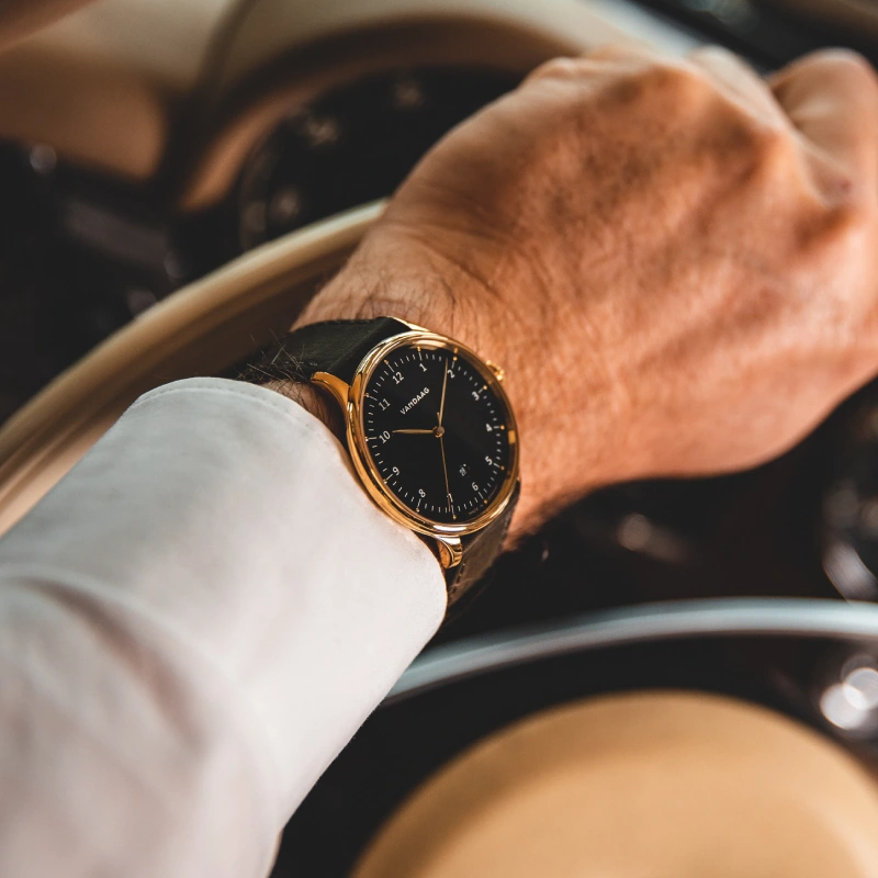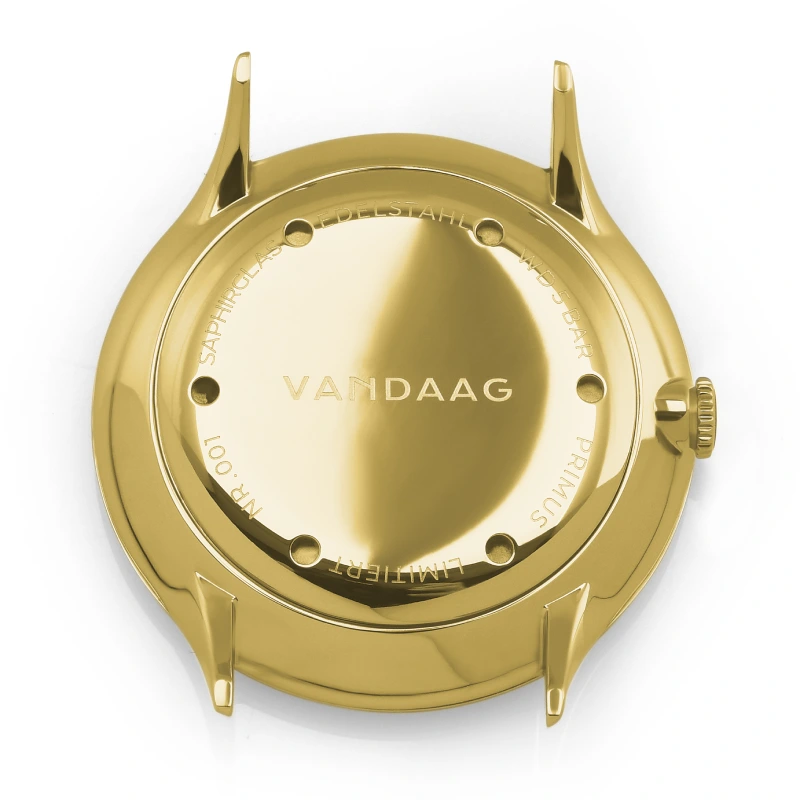 Mit ihrem Retro-Look, dem mit Gold plattierten 40mm Edelstahlgehäuse, dem soften Lederband, dem fein gewölbten silber-weißen Zifferblatt und den klaren arabischen Zahlen ist die Primus eine sehr elegant-klassisch anmutende Dresswatch.